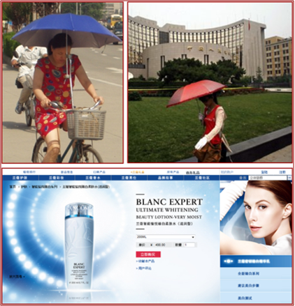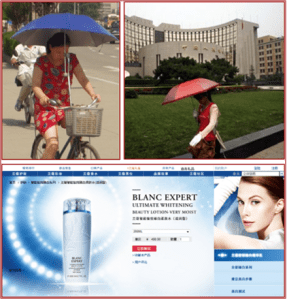 Ceux qui habitent Montréal étaient heureux hier que les parapluies aient été inventés … 70 mm en peu de temps, c’est plus que ce que les plantes humaines peuvent prendre ! En Chine, les parapluies servent à plus que la protection contre la pluie. Ils protègent du soleil, en promenade ou à vélo. Il est vrai que de s’abriter sous un parapluie ou de porter des gants, coûtent moins cher que d’acheter une crème blanchissante de Lancôme. Alors que nous associons hâle et santé, et achetons des crèmes en conséquence, les Chinoises, quant à elles, cherchent par tous les moyens à conserver leur peau blanche. Pourquoi ?