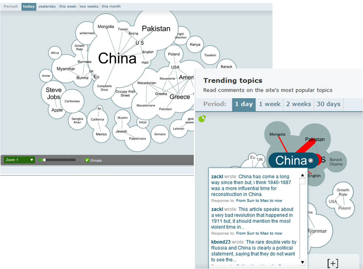 La version en ligne de The Economist propose chaque jour un « nuage des opinions » (Opinion Cloud). Le nuage des opinions est une agrégation de tous les commentaires des lecteurs de la publication. Il est rendu possible grâce à une collaboration avec Appinions et Infomous, des technologies d’extraction d’opinions et de visualisation de texte. Le nuage est disponible pour la journée en cours, la dernière semaine, les deux dernières et les 30 derniers jours. En positionnant la souris sur, par exemple la Chine, la liste des commentaires apparaît. La Chine fait souvent l’objet de discussions nourries … suis-je surprise ? Facebook serait plus intéressant si ce type de visualisation était offert au lieu de longues listes d’opinions et de clips.