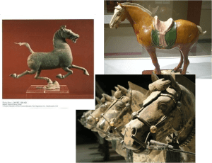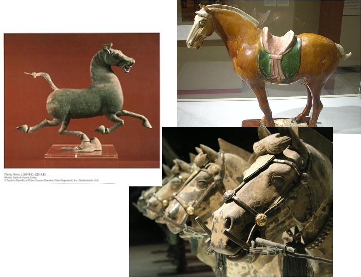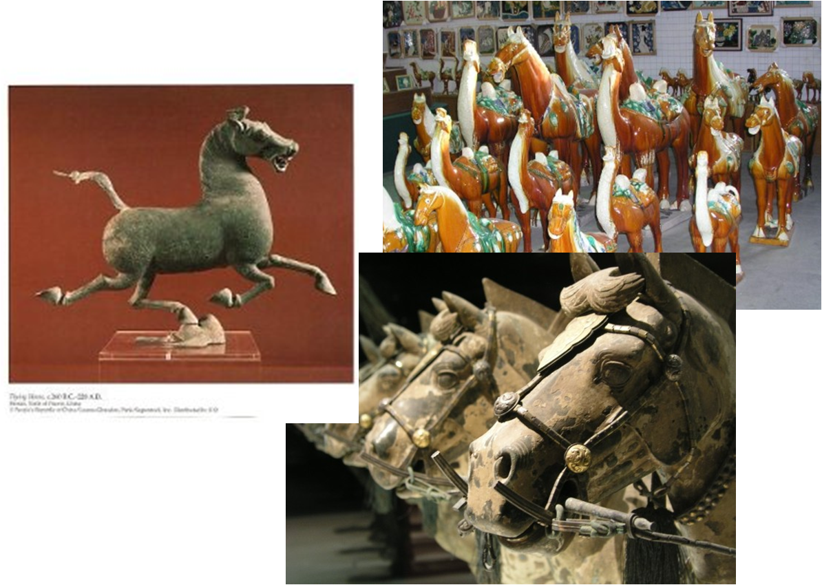 Changement de sujet, belle image que celle d’un cheval volant non ? Eh bien, les Chinois en ont un, il est en bronze et remonte à plus de 200 ans avant notre ère. J’en ai acheté un (une copie bien sûr) à Chengdu il y a quelques années. Malheureusement, sans une base appropriée, il était toujours sur le dos. Il y a aussi les chevaux plus terre à terre trouvés dans le tombeau de Qin Shihuangdi et ceux de la dynastie des Tang, célèbres pour leurs coloris. Selon moi, c’est avec eux en tête que les gens de Beijing iront contempler les magnifiques chevaux de Cavalia.