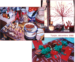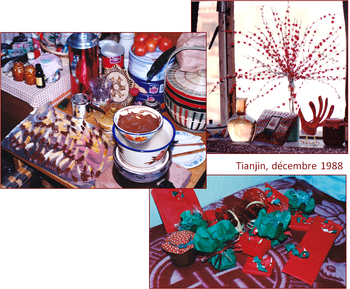Dans les années 80, la Chine du temps des fêtes était moins festive qu’elle ne l’est maintenant dans les grandes villes. À Tianjin, les objets rouges étaient faciles à trouver; rien de surprenant là. Ce n’était pas le cas des oranges (hors-saison) et du chocolat non cireux pour faire de petits cadeaux typiques (voir ci-dessous). Pour cela, il fallait faire de longues heures de train pour aller au Magasin de l’amitié à Beijing. Mais qu’à cela ne tienne. L’idée de fêter avec les amis, dans un environnement où le charbon grisonnais le paysage et le froid s’infiltrait par les fenêtres, en valait la peine.