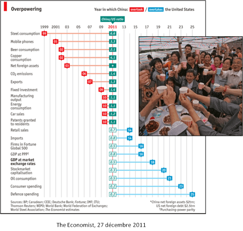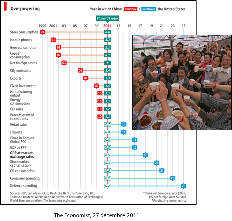 Le sujet de la domination chinoise m’intéresse beaucoup, entre autres pour la polarisation qu’il suscite partout dans cette partie de la planète. D’un coté, il y a ceux qui soutiennent que les Chinois complotent sournoisement pour prendre la place des Américains. Ceux là invoquent entre autres les preuves suivantes :