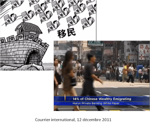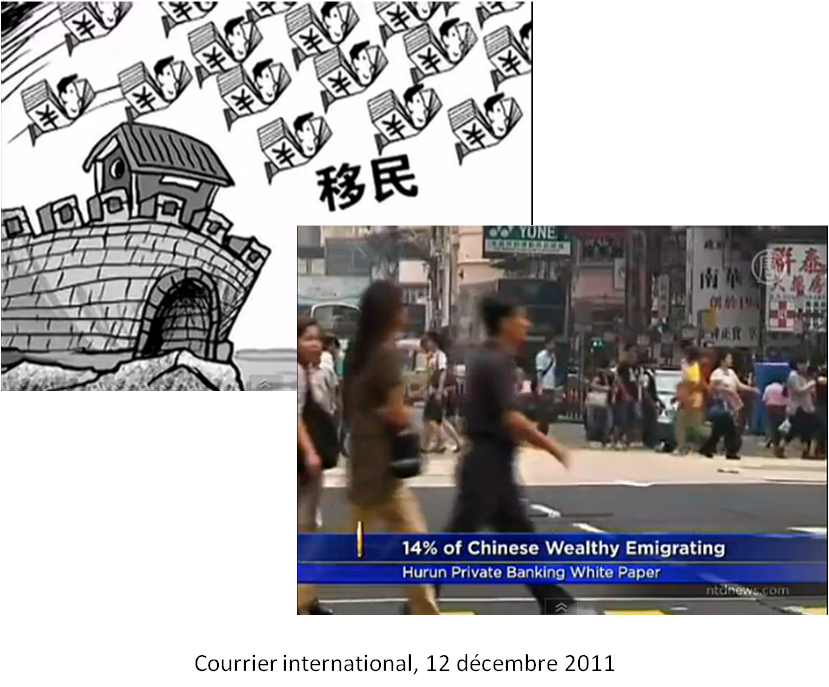 Ils cherchent à quitter la Chine, que certains associent à un bateau en train de couler. Pour justifier leur départ de la mère-patrie, certains invoquent le contexte difficile et la corruption du régime et de ses représentants locaux. D’autres espèrent donner à leur enfants un environnement de meilleure qualité pour étudier et grandir. Près de la moitié des Chinois dont le patrimoine excède 10 millions de yuans (1,7 millions de yuans) envisageraient d’émigrer. Hong Kong constitue une destination de choix mais le Canada figure aussi en haut de la liste (Courrier international, 12 décembre 2011)
